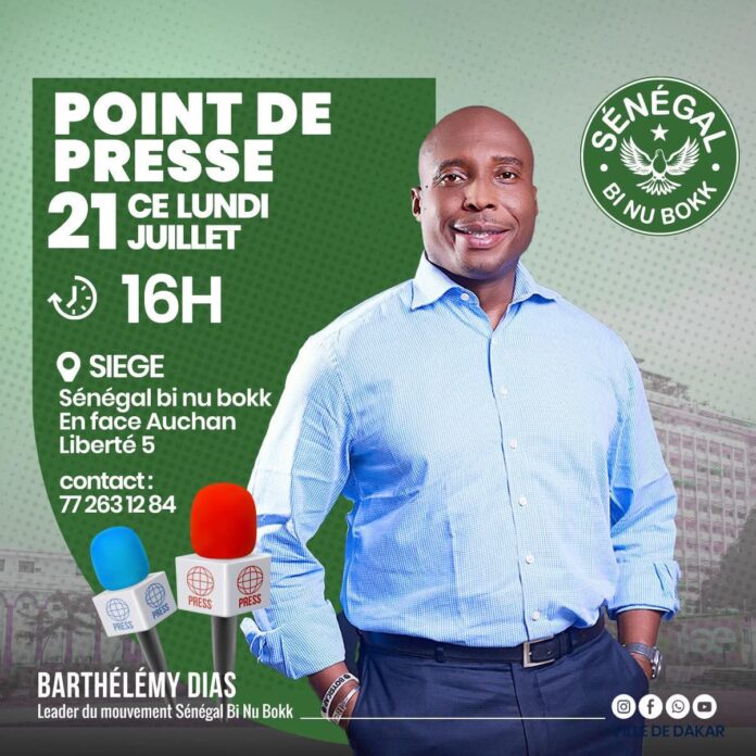 Le leader du mouvement Sénégal Bi Nu Bokk, Barthélemy Dias, donne rendez-vous ce lundi 21 juillet 2025 à 16h, au siège du Mouvement situé aux Allées de la Rue 13 Castors, en face du Auchan Liberté 5, pour un point de presse important.