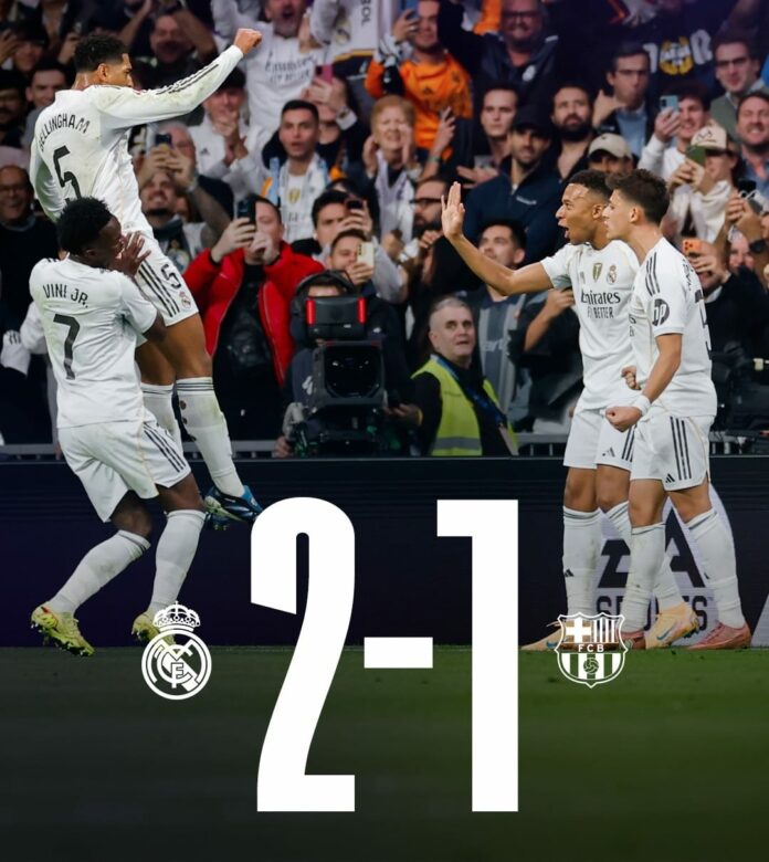 Le Real Madrid a remporté le match contre Barcelone avec un score de 2-1, grâce aux buts de Kylian Mbappé à la 22e minute et de Jude Bellingham à la 43e minute. Le Barça avait égalisé temporairement grâce à Fermín López à la 38e minute.