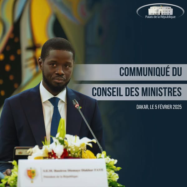 Le Chef de l’Etat, Son Excellence, Monsieur Bassirou Diomaye Diakhar FAYE a présidé, ce mercredi 05 février 2025, la réunion hebdomadaire du Conseil des Ministres, au Palais de la République.