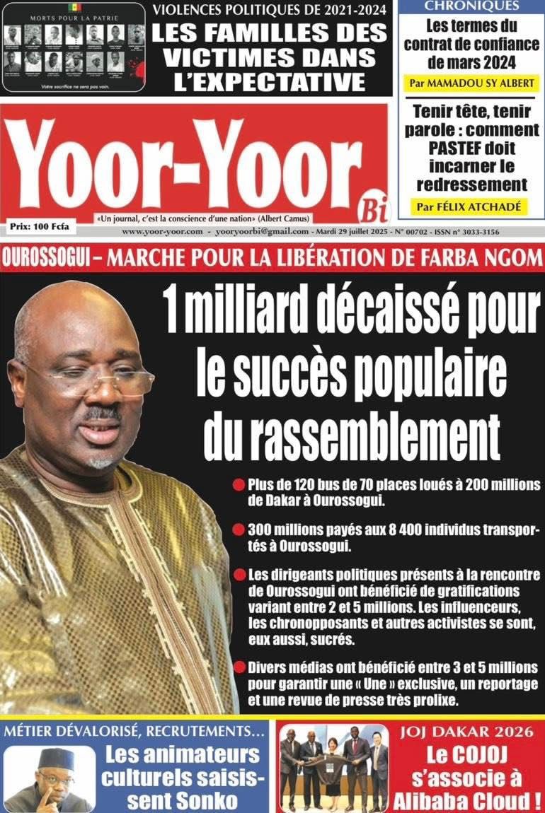 Le pool d’avocats de Farba Ngom compte déposer une plainte, ce mercredi 30 juillet à la cybercriminalité. Cela fait suite à la publication du journal Yoor Yoor affirmant que 1 milliard FCFA aurait été décaissé pour financer la mobilisation organisée récemment à Ourossogui.