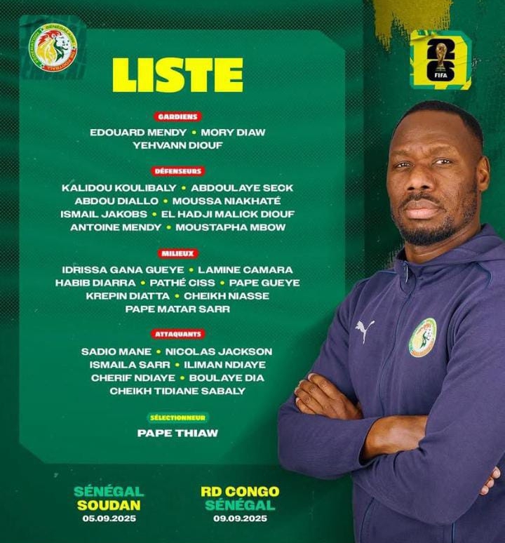 Le sélectionneur national Pape Thiaw a publié la liste des joueurs retenus pour les deux prochaines rencontres des éliminatoires de la Coupe du monde 2026 ce jeudi 28 août 2025.
