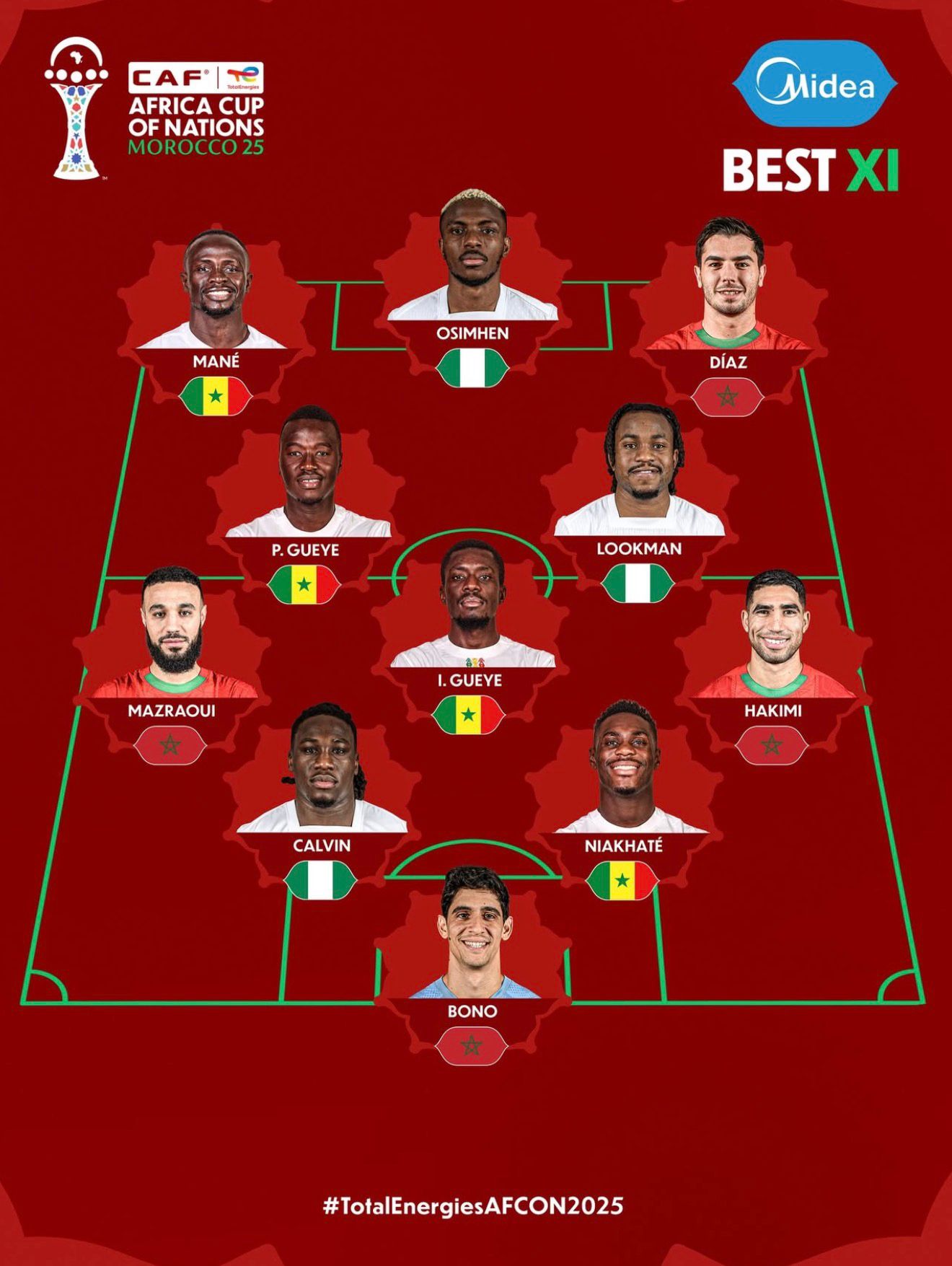Ce mardi 21 janvier, la Confédération africaine de football (CAF) a révélé l’équipe-type des 11 meilleurs joueurs de la CAN 2025 qui s’est déroulée au Maroc. Le Sénégal, champion d’Afrique, est représenté par quatre de ses joueurs : Sadio Mané, Pape Guèye, Idrissa Gana Guèye et Moussa Niakhaté.