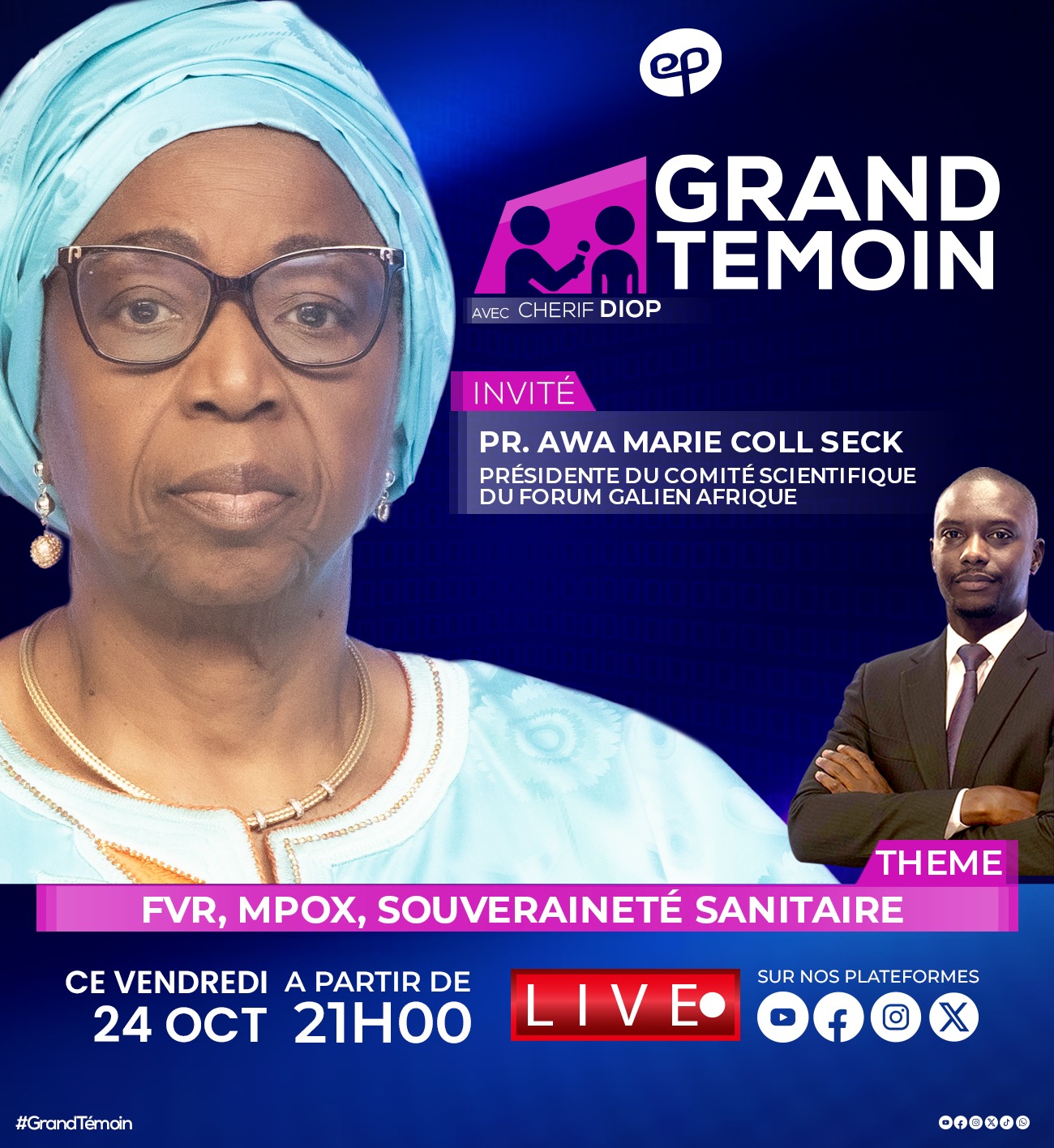 Invitée de l’émission « Grand Témoin », animée par Cherif DIOP sur la chaîne YouTube d’Evenprod (diffusion ce vendredi à 21h), l’ancienne ministre de la Santé, le Professeur Awa Marie Coll Seck, a suggéré une gestion au plus haut niveau des épidémies de la Fièvre de la Vallée du Rift (FVR) et du MPOX (variole du singe).