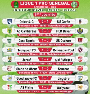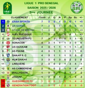 Le 16 novembre 2025, la troisième journée de Ligue 1 s’est déroulée dans son intégralité. À l’issue de cette journée, le Casa Sports s’est installé en tête du classement après avoir battu l’US Ouakam. L’US Gorée, impressionnante contre le Dakar Sacré-Cœur, est également en haut du tableau. Le Jaraaf, par contre, continue de décevoir.