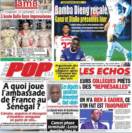 La une des journaux du 02 Septembre: Bamba Dieng recalé, Gana et Diallo présentés hier; 37 combats, 23 victoires, 14 défaites, l’école Balla Gaye impressionne; exposition pétrole et gaz: Macky « on n’a rien à cacher, ce qu’on fait est transparent »; problèmes visa des étudiants, A quoi joue l’ambassade de France au Sénégal?