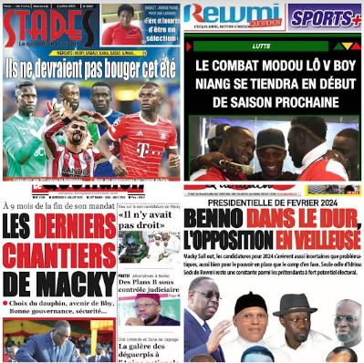 Accueil A la Une La une des journaux du 05 juillet: présidentielle de février 2024: Benno... A la Une La une des journaux du 05 juillet: présidentielle de février 2024: Benno dans le dur, l’opposition en veilleuse Par ledakaroistv - juillet 5, 2023 FacebookTwitterPinterestWhatsApp ARTICLES CONNEXESPLUS DE L'AUTEUR A la Une Extradition de Madiambal Diagne : Le Tribunal de Versailles a mis en délibéré le 3 mars 2026 A la Une Comment les Sénégalais et les Marocains sont-ils des frères ? A la Une Polémique sur les 80 ha à Mbour : Babacar Ngom renonce au titre foncier au profit de l’État du Sénégal Transport urbain à Dakar : Cohabitation entre Transports en Commun et... Société février 3, 2026 Extradition de Madiambal Diagne : Le Tribunal de Versailles a mis... A la Une février 3, 2026 Élections départementales et municipales: l’alerte du FDR ! Politique février 3, 2026 Comment les Sénégalais et les Marocains sont-ils des frères ? A la Une février 1, 2026 Sûreté urbaine de Dakar: Doudou Wade convoqué ce vendredi Société janvier 30, 2026