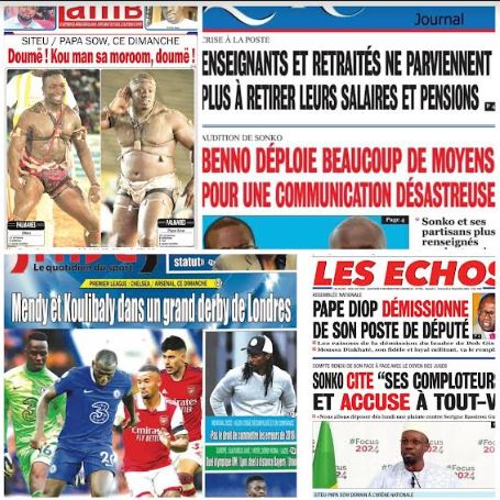La une des journaux du 05 Novembre: Siteu/Papa Sow, ce diamanche, doume! kou man sa moroom, doume!; Cride à la poste, enseignants et retraités ne parviennent plus à retirer leurs salaires et pensions; Premier league chealsea/ arsenal, ce dimanche, Mendy et Koulibaly dans un grand derby de Londres, Assemblée nationale, Pape Diop démissionne de son poste de député