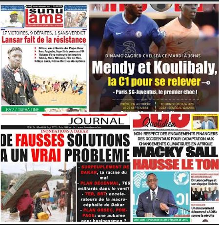La une des journaux du 06 Septembre: 17 victoires, 09 défaites, 1 sans verdict, Lamsar fait de la résistance; Mendy et Koulibaly, la C1 pour se relever; Nos respect des engagement financiers, Macky Sall hausse le ton; Inondations à Dakar, de fausses solutions à un vrai problème