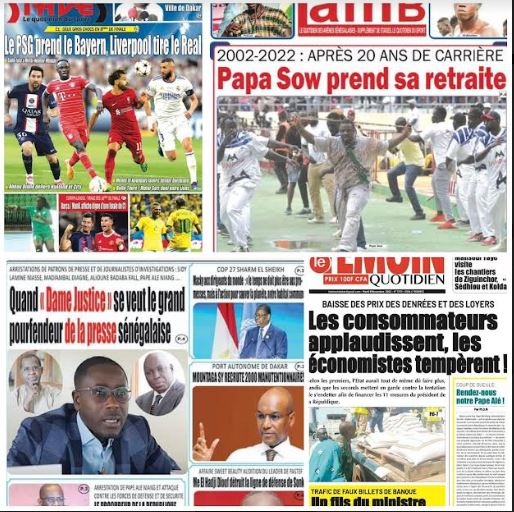 La une des journaux du 08 Novembre : C1 deux gros chocs en 8eme de finale, le PSG prend le Bayern, Liverpool tire Real ; 2002-2022 après 20 ans de carrière, Papa Sow prend sa retraite ; attestation de patron de presse et de journalistes d’investigations, Sidy Lamine Niasse, Madiambal Diagne, Alioune Badara Fall, Pape Alé Niang, quand « Dame justice» se veut le grand pourfendeur de la presse sénégalaise ; baisse des prix des denrées et des loyers, les consommateurs applaudissent, les économistes tempèrent