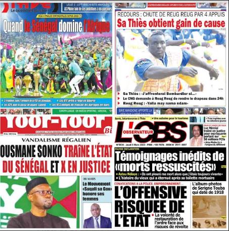 Accueil A la Une La une des journaux du 09 Mars: Vandalisme régalien, Ousmane Sonko traine... A la Une La une des journaux du 09 Mars: Vandalisme régalien, Ousmane Sonko traine l’Etat du Sénégal et X en justice… Par ledakaroistv - mars 9, 2023 FacebookTwitterPinterestWhatsApp ARTICLES CONNEXESPLUS DE L'AUTEUR A la Une Braquage de coffre-fort à la BICIS : Mme Awa Diop dénonce le silence des autorités A la Une Protection des enfants contre les addictions: SABS mobilise la communauté éducative vers la sensibilisation A la Une Guinée-Bissau : des organisations panafricaines et la diaspora bissau-guinéenne mobilisées à Dakar pour dénoncer une confiscation du pouvoir Braquage de coffre-fort à la BICIS : Mme Awa Diop dénonce... A la Une décembre 13, 2025 Protection des enfants contre les addictions: SABS mobilise la communauté éducative... A la Une décembre 13, 2025 Guinée-Bissau : des organisations panafricaines et la diaspora bissau-guinéenne mobilisées à... A la Une décembre 13, 2025 CAN 2025 : Assane Diao et Habib Diarra sur la liste... A la Une décembre 13, 2025 Après la baisse du carburant: Aftu annonce une réduction du prix... A la Une décembre 13, 2025