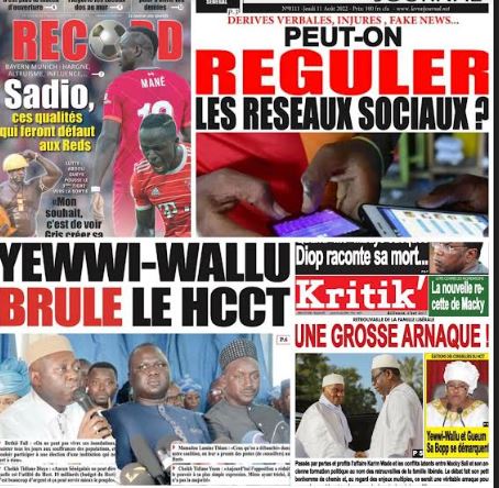 Accueil A la Une La une des journaux du 11 Août: Sadio, ses qualités qui feront... A la Une La une des journaux du 11 Août: Sadio, ses qualités qui feront défaut aux Reds; Yewwi-Wallu brule le HCCT; Peut-on réguler les réseaux sociaux; retrouvaille de la famille libérale, une grosse arnaque Par ledakaroistv - août 11, 2022 FacebookTwitterPinterestWhatsApp ARTICLES CONNEXESPLUS DE L'AUTEUR A la Une Polémique sur les 80 ha à Mbour : Babacar Ngom renonce au titre foncier au profit de l’État du Sénégal A la Une Affaire Doudou Wade: Pape Ngagne Ndiaye convoqué à la Sûreté Urbaine ce vendredi A la Une Urgent: Le collectif des avocats de Mame Mbaye NIANG face à la presse ce vendredi Sûreté urbaine de Dakar: Doudou Wade convoqué ce vendredi Société janvier 30, 2026 Dédicace du livre Oser Agir: l’auteur Abdourahmane Fall encourage la jeunesse à... Société janvier 30, 2026 Polémique sur les 80 ha à Mbour : Babacar Ngom renonce... A la Une janvier 29, 2026 Affaire Doudou Wade: Pape Ngagne Ndiaye convoqué à la Sûreté Urbaine... A la Une janvier 29, 2026 Urgent: Le collectif des avocats de Mame Mbaye NIANG face à... A la Une janvier 29, 2026