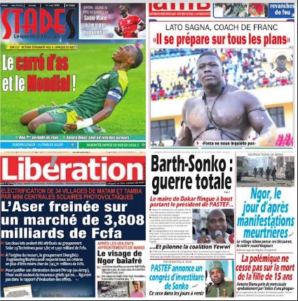 Accueil A la Une La une des journaux du 11 Mai: Barth-Sonko guerre totale A la Une La une des journaux du 11 Mai: Barth-Sonko guerre totale Par ledakaroistv - mai 11, 2023 FacebookTwitterPinterestWhatsApp ARTICLES CONNEXESPLUS DE L'AUTEUR A la Une Extradition de Madiambal Diagne : Le Tribunal de Versailles a mis en délibéré le 3 mars 2026 A la Une Comment les Sénégalais et les Marocains sont-ils des frères ? A la Une Polémique sur les 80 ha à Mbour : Babacar Ngom renonce au titre foncier au profit de l’État du Sénégal Transport urbain à Dakar : Cohabitation entre Transports en Commun et... Société février 3, 2026 Extradition de Madiambal Diagne : Le Tribunal de Versailles a mis... A la Une février 3, 2026 Élections départementales et municipales: l’alerte du FDR ! Politique février 3, 2026 Comment les Sénégalais et les Marocains sont-ils des frères ? A la Une février 1, 2026 Sûreté urbaine de Dakar: Doudou Wade convoqué ce vendredi Société janvier 30, 2026