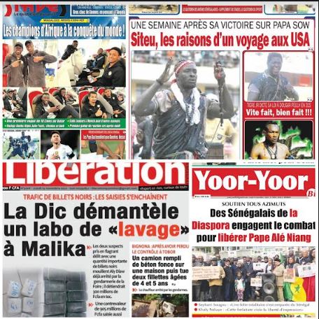 La une des journaux du 14 Novembre: Mondial 2022, arrivés à Doha hier, Les champions d’Afrique à la conquête du monde; Une semaine après sa victoire sur Papa Sow, Siteu, les raisons d’un voyage aux USA; Trafic de billets noirs, les saisies s’enchainent, la DIC démantèle un labo de « lavage » à Malika; Soutien tous Azimuts, des sénégalais de la diaspora engagent le combat pour libérer Pape Alé Niang