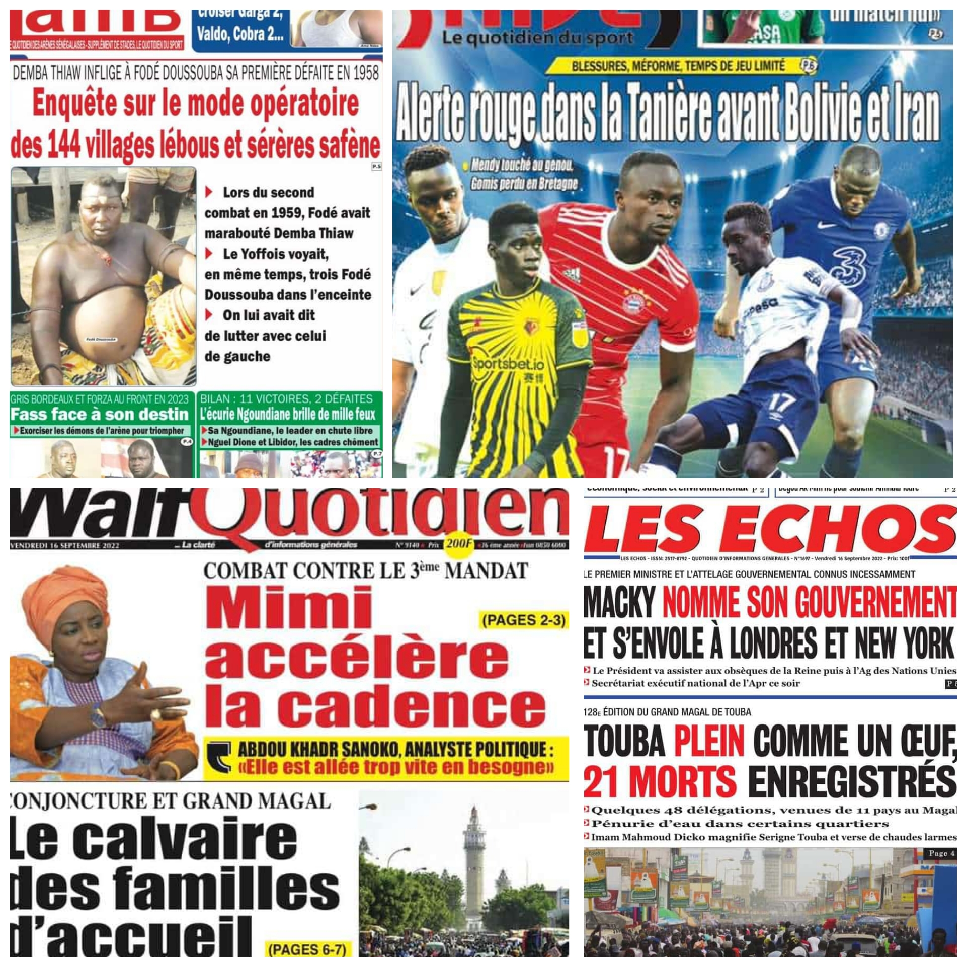 La une des journaux du 16 septembre : Enquête sur le mode opératoire des 144 villages lébous et séréres safene; alerte rouge dans la tanière avant Bolivie et Iran ; Combat contre le 3e mandat, Mimi accélère la cadence ; Touba plein comme un œuf, 21 morts enregistrés