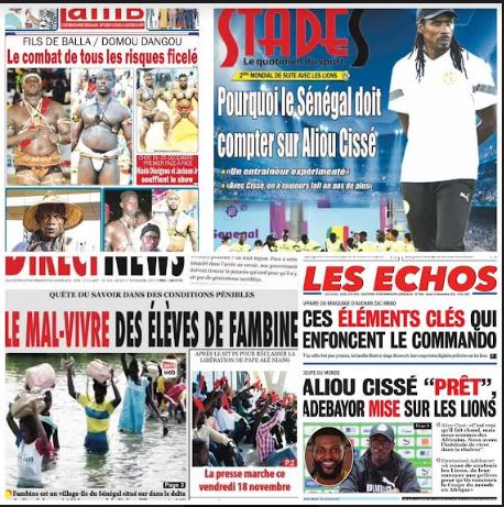La une des journaux du 17 Novembre : Fils de Balla/ Domou Dangou, le combat de tous les risques ficelé; 2eme mondial de suite avec les lions pourquoi le Sénégal doit compter sur Aliou Cissé; Quête du savoir dans des conditions pénibles, le mal-vivre des élèves de Fambine; Affaire du braquage d’Auchan à ZAC Mbao, ces éléments clés qui enfoncent le Commando