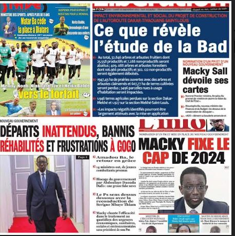 La une des journaux du 19 septembre : Mendy, Noah, Ndiakhaté, Izo et Keita Baldé vers le forfait ; Construction de l’autoroute Dakar, Tivaouane, Saint Louis, ce que révèle l’étude de la Bad; nouveau gouvernement, Départs inattendus, Bannis réhabilités et frustrations à Gogo ; Macky fixe le cap de 2024