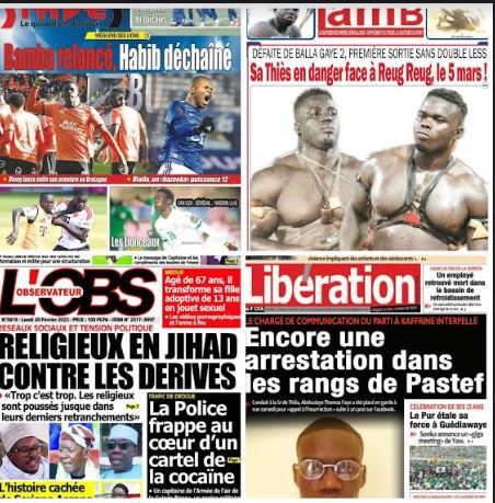 Accueil A la Une La une des journaux du 20 Février: Le chargé de communication du... A la Une La une des journaux du 20 Février: Le chargé de communication du parti à Kaffrine interpellé, encore une arrestation dans les rangs de Pastef… Par ledakaroistv - février 20, 2023 FacebookTwitterPinterestWhatsApp ARTICLES CONNEXESPLUS DE L'AUTEUR A la Une Braquage de coffre-fort à la BICIS : Mme Awa Diop dénonce le silence des autorités A la Une Protection des enfants contre les addictions: SABS mobilise la communauté éducative vers la sensibilisation A la Une Guinée-Bissau : des organisations panafricaines et la diaspora bissau-guinéenne mobilisées à Dakar pour dénoncer une confiscation du pouvoir Braquage de coffre-fort à la BICIS : Mme Awa Diop dénonce... A la Une décembre 13, 2025 Protection des enfants contre les addictions: SABS mobilise la communauté éducative... A la Une décembre 13, 2025 Guinée-Bissau : des organisations panafricaines et la diaspora bissau-guinéenne mobilisées à... A la Une décembre 13, 2025 CAN 2025 : Assane Diao et Habib Diarra sur la liste... A la Une décembre 13, 2025 Après la baisse du carburant: Aftu annonce une réduction du prix... A la Une décembre 13, 2025