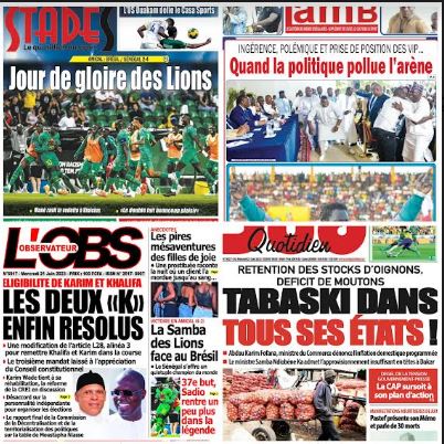 Accueil A la Une La une des journaux du 21 Juin: rétention des stocks d’oignons, déficit... A la Une La une des journaux du 21 Juin: rétention des stocks d’oignons, déficit de moutons, Tabaski dans tous les états Par ledakaroistv - juin 21, 2023 FacebookTwitterPinterestWhatsApp ARTICLES CONNEXESPLUS DE L'AUTEUR A la Une Braquage de coffre-fort à la BICIS : Mme Awa Diop dénonce le silence des autorités A la Une Protection des enfants contre les addictions: SABS mobilise la communauté éducative vers la sensibilisation A la Une Guinée-Bissau : des organisations panafricaines et la diaspora bissau-guinéenne mobilisées à Dakar pour dénoncer une confiscation du pouvoir Braquage de coffre-fort à la BICIS : Mme Awa Diop dénonce... A la Une décembre 13, 2025 Protection des enfants contre les addictions: SABS mobilise la communauté éducative... A la Une décembre 13, 2025 Guinée-Bissau : des organisations panafricaines et la diaspora bissau-guinéenne mobilisées à... A la Une décembre 13, 2025 CAN 2025 : Assane Diao et Habib Diarra sur la liste... A la Une décembre 13, 2025 Après la baisse du carburant: Aftu annonce une réduction du prix... A la Une décembre 13, 2025