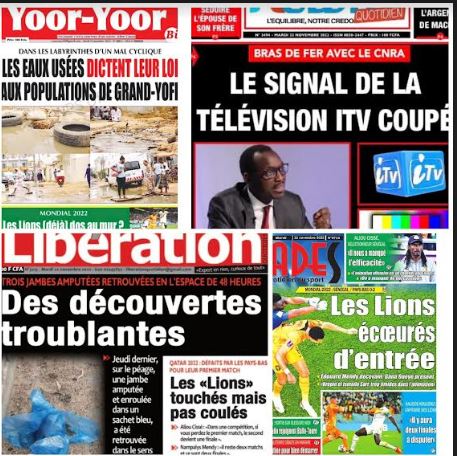 La une des journaux du 22 Novembre : Dans les labyrinthes d’un mal cyclique, les eaux usées dictent leur loi aux populations de Grand Yoff ; Bras de fer avec le CNRA, le signal de la télévision ITV coupé; Trois jambes amputées retrouvées en espace de 48h, des découvertes troublantes ; Mondial 2022, Sénégal/ Pays Bas (0-2), les lions écœurés d’entrée