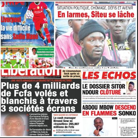 Accueil A la Une La une des journaux du 24 Janvier: Affaire du viol presumé contre... A la Une La une des journaux du 24 Janvier: Affaire du viol presumé contre une mineure de 17 ans, le dossier Sitor Ndour clôturé… Par ledakaroistv - janvier 24, 2023 FacebookTwitterPinterestWhatsApp ARTICLES CONNEXESPLUS DE L'AUTEUR A la Une Extradition de Madiambal Diagne : Le Tribunal de Versailles a mis en délibéré le 3 mars 2026 A la Une Comment les Sénégalais et les Marocains sont-ils des frères ? A la Une Polémique sur les 80 ha à Mbour : Babacar Ngom renonce au titre foncier au profit de l’État du Sénégal Transport urbain à Dakar : Cohabitation entre Transports en Commun et... Société février 3, 2026 Extradition de Madiambal Diagne : Le Tribunal de Versailles a mis... A la Une février 3, 2026 Élections départementales et municipales: l’alerte du FDR ! Politique février 3, 2026 Comment les Sénégalais et les Marocains sont-ils des frères ? A la Une février 1, 2026 Sûreté urbaine de Dakar: Doudou Wade convoqué ce vendredi Société janvier 30, 2026
