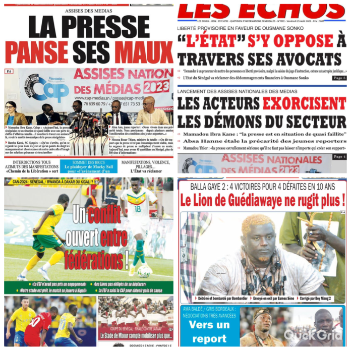 Accueil A la Une La une des journaux du 25 Aout: assises des médias, la presse... A la Une La une des journaux du 25 Aout: assises des médias, la presse panse ses maux Par ledakaroistv - août 25, 2023 FacebookTwitterPinterestWhatsApp ARTICLES CONNEXESPLUS DE L'AUTEUR A la Une Braquage de coffre-fort à la BICIS : Mme Awa Diop dénonce le silence des autorités A la Une Protection des enfants contre les addictions: SABS mobilise la communauté éducative vers la sensibilisation A la Une Guinée-Bissau : des organisations panafricaines et la diaspora bissau-guinéenne mobilisées à Dakar pour dénoncer une confiscation du pouvoir Braquage de coffre-fort à la BICIS : Mme Awa Diop dénonce... A la Une décembre 13, 2025 Protection des enfants contre les addictions: SABS mobilise la communauté éducative... A la Une décembre 13, 2025 Guinée-Bissau : des organisations panafricaines et la diaspora bissau-guinéenne mobilisées à... A la Une décembre 13, 2025 CAN 2025 : Assane Diao et Habib Diarra sur la liste... A la Une décembre 13, 2025 Après la baisse du carburant: Aftu annonce une réduction du prix... A la Une décembre 13, 2025