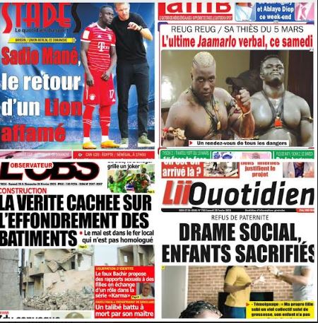 Accueil A la Une La une des journaux du 25 Février: Refus de paternité, drame social,... A la Une La une des journaux du 25 Février: Refus de paternité, drame social, enfants sacrifiés… Par ledakaroistv - février 25, 2023 FacebookTwitterPinterestWhatsApp ARTICLES CONNEXESPLUS DE L'AUTEUR A la Une Braquage de coffre-fort à la BICIS : Mme Awa Diop dénonce le silence des autorités A la Une Protection des enfants contre les addictions: SABS mobilise la communauté éducative vers la sensibilisation A la Une Guinée-Bissau : des organisations panafricaines et la diaspora bissau-guinéenne mobilisées à Dakar pour dénoncer une confiscation du pouvoir Braquage de coffre-fort à la BICIS : Mme Awa Diop dénonce... A la Une décembre 13, 2025 Protection des enfants contre les addictions: SABS mobilise la communauté éducative... A la Une décembre 13, 2025 Guinée-Bissau : des organisations panafricaines et la diaspora bissau-guinéenne mobilisées à... A la Une décembre 13, 2025 CAN 2025 : Assane Diao et Habib Diarra sur la liste... A la Une décembre 13, 2025 Après la baisse du carburant: Aftu annonce une réduction du prix... A la Une décembre 13, 2025