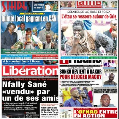 Accueil A la Une La une des journaux du 25 Mai: incendie du depot des bus... A la Une La une des journaux du 25 Mai: incendie du depot des bus en panne de DDD à Keur Massar, Nfally Sané « vendu » par un de ses amis Par ledakaroistv - mai 25, 2023 FacebookTwitterPinterestWhatsApp ARTICLES CONNEXESPLUS DE L'AUTEUR A la Une Extradition de Madiambal Diagne : Le Tribunal de Versailles a mis en délibéré le 3 mars 2026 A la Une Comment les Sénégalais et les Marocains sont-ils des frères ? A la Une Polémique sur les 80 ha à Mbour : Babacar Ngom renonce au titre foncier au profit de l’État du Sénégal Transport urbain à Dakar : Cohabitation entre Transports en Commun et... Société février 3, 2026 Extradition de Madiambal Diagne : Le Tribunal de Versailles a mis... A la Une février 3, 2026 Élections départementales et municipales: l’alerte du FDR ! Politique février 3, 2026 Comment les Sénégalais et les Marocains sont-ils des frères ? A la Une février 1, 2026 Sûreté urbaine de Dakar: Doudou Wade convoqué ce vendredi Société janvier 30, 2026