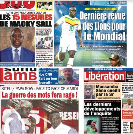 La une des journaux du 27 Septembre: Lutte contre la cherté de la vie, les 15 mesures de Macky Sall; Siteu/ Papa Sow, face à face ce mardi, la guerre des mots fera rage; Amical Iran/ Sénégal à 14h 30, dernière revue des lions pour le mondial; Suicide de Nafissatou Diedhiou dite Fina, les derniers développements de l’enquête