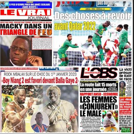 La une des journaux du 28 Septembre : Défié par Mimi, pressé par Yewwi, acculé par le social, Macky dans un triangle de feu; Amical Iran/ Sénégal (1-1), des choses à revoir avant Qatar 2022; Rock Mbalax sur le choc du 1er janvier 2023, «Boy Niang 2 est favori devant Balla Gaye 2»; Collisions mortelles, la route fait 15 morts en une journée