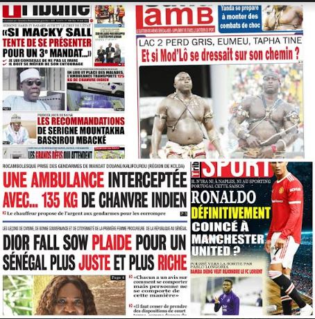 La une des journaux du 30 Aout: Serigne Habib Sy à Macky Sall: » Je lui conseille de ne pas faire un 3e mandat »; Ronaldo définitivement coincé à Manchester united? Kolda, une ambulante interceptée avec 135 kg de chanvre indien; Lac 2 perd Gris, Eumeu, Tapha tine et si Modou se dressait sur son chemin?