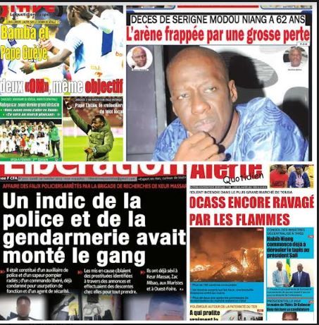 La une des journaux du 30 Janvier: Affaire des faux policiers arrêtés par la brigade de recherche de Keur Massar, un indic de la police et de la gendarmerie avait monté le gang…