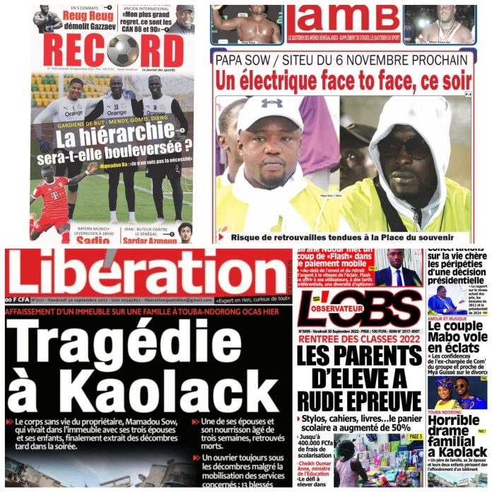 La une des journaux du 30 Septembre : Gardien de but: Mendy, Gomis, Dieng, la hiérarchie sera-t-elle bouleversée ; Papa Sow/ Siteu du 6 novembre prochain, un électrique face to face, ce soir; affaissement d’un immeuble sur une famille à Touba Ndorong Ocas hier, rentrée des classes 2022, les parents d’élèves à rude épreuve