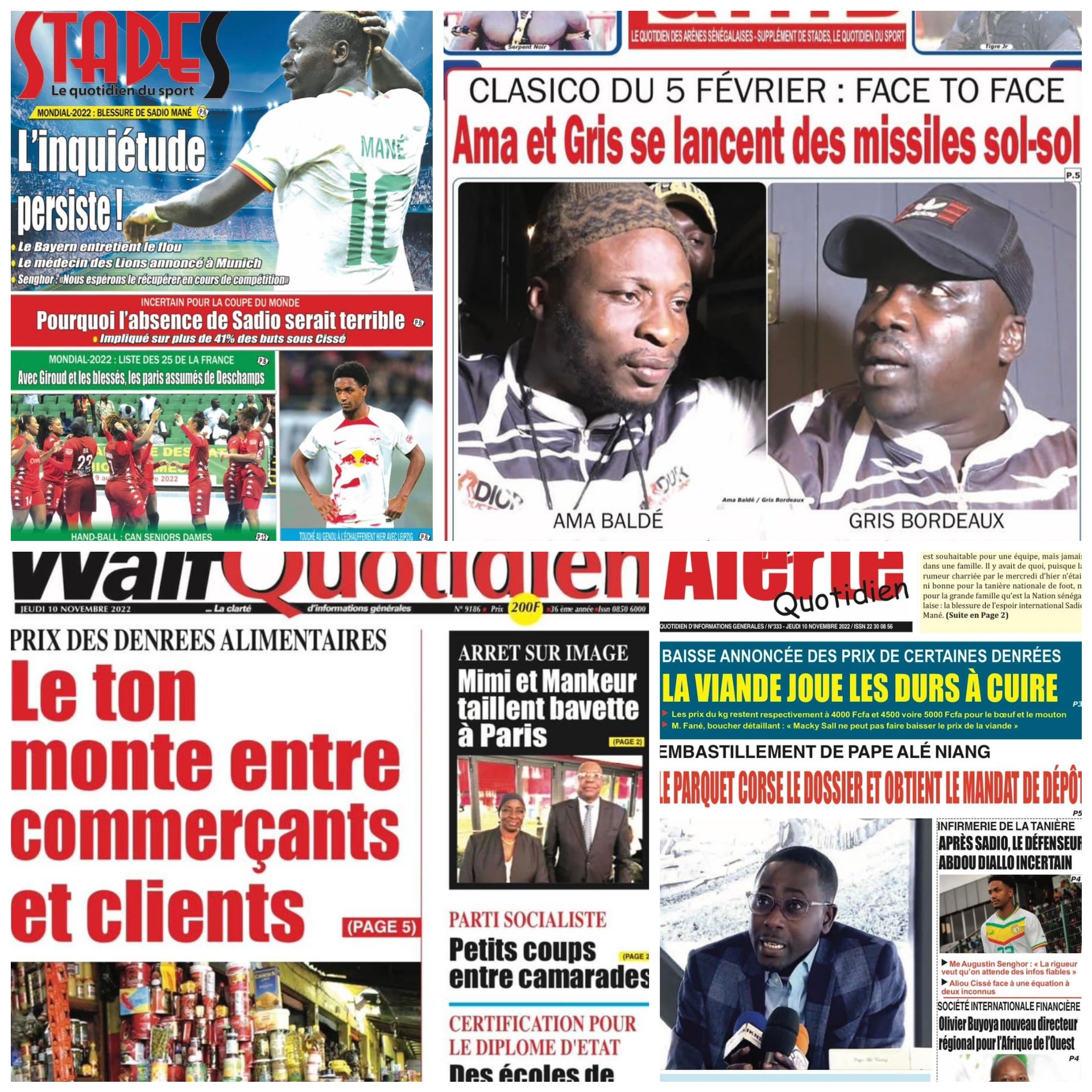 La une des journaux du 10 Novembre : mondial 2022, blessures de Sadio Mané, l’inquiétude persiste; clasico du 05 février, face to face Ama et Gris se lancent des missiles sol-sol; prix des denrées alimentaires, le ton monte entre commerçants et clients; Embastillement de Pape Alé Niang, le parquet corse le dossier et obtient le mandat de dépôt