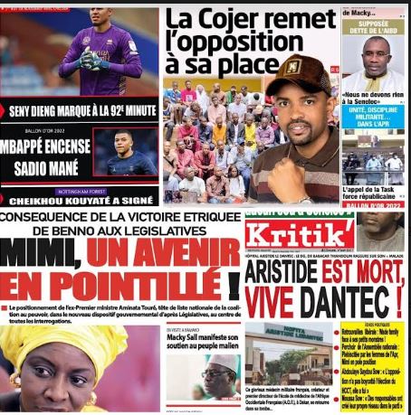 Accueil A la Une La une du 16 Août: Seny Dieng marque à la 92e minute;... A la Une La une du 16 Août: Seny Dieng marque à la 92e minute; Mbappé encense Mané; Mimi, un avenir en pointillé; la cojer remet l’opposition à sa place; Aristide est mort vive Dantec Par ledakaroistv - août 16, 2022 FacebookTwitterPinterestWhatsApp ARTICLES CONNEXESPLUS DE L'AUTEUR A la Une Braquage de coffre-fort à la BICIS : Mme Awa Diop dénonce le silence des autorités A la Une Protection des enfants contre les addictions: SABS mobilise la communauté éducative vers la sensibilisation A la Une Guinée-Bissau : des organisations panafricaines et la diaspora bissau-guinéenne mobilisées à Dakar pour dénoncer une confiscation du pouvoir Braquage de coffre-fort à la BICIS : Mme Awa Diop dénonce... A la Une décembre 13, 2025 Protection des enfants contre les addictions: SABS mobilise la communauté éducative... A la Une décembre 13, 2025 Guinée-Bissau : des organisations panafricaines et la diaspora bissau-guinéenne mobilisées à... A la Une décembre 13, 2025 CAN 2025 : Assane Diao et Habib Diarra sur la liste... A la Une décembre 13, 2025 Après la baisse du carburant: Aftu annonce une réduction du prix... A la Une décembre 13, 2025
