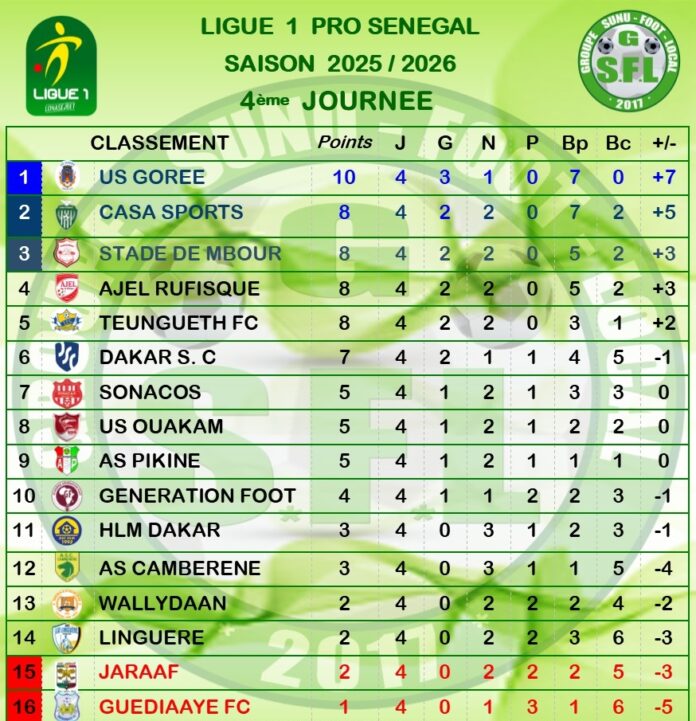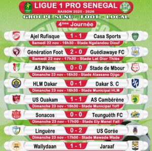 Le samedi 22 novembre 2025 a marqué le début de la quatrième journée de la Ligue 1 sénégalaise avec un match attendu entre l’AJEL de Rufisque et le Casa Sports, qui s’est terminé sur un score de 1-1. L’ US Gorée prend la première place du classement, le Jaraaf est l’avant dernier après 4 journées.