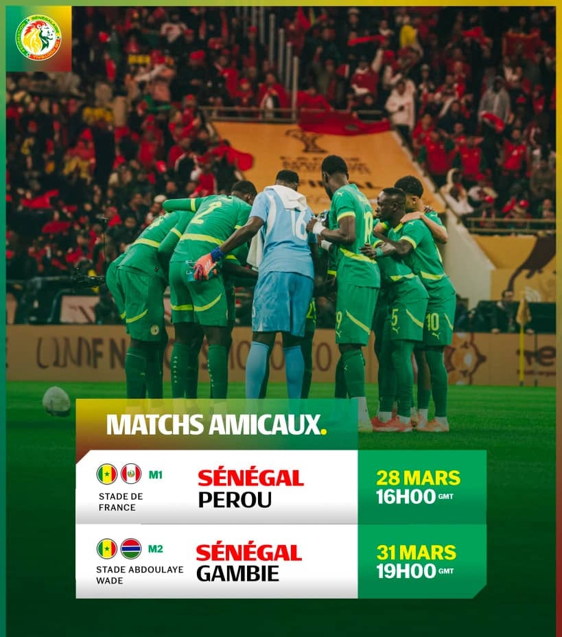 L’équipe nationale sénégalaise disputera deux matchs amicaux internationaux contre le Pérou au Stade de France le 28 mars à 16h GMT. Par la suite, les champions d’Afrique en titre affronteront la Gambie le 31 mars au Stade Me Abdoulaye Wade de Diamniadio à 19h.