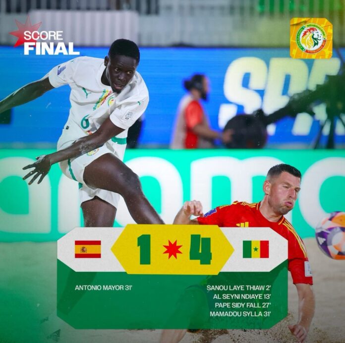 Les lions du football de plage ont réalisé un excellent début lors de la Coupe du Monde de Beach Soccer en s’imposant 4-1 contre l’équipe nationale d’Espagne. Les buteurs de l’équipe sénégalaise incluent le capitaine et gardien Al Seyni Ndiaye, Sanoulaye Thiaw, Pape Sidy Fall et Mamadou Sylla. Al Seyni Ndiaye a été élu homme du match.