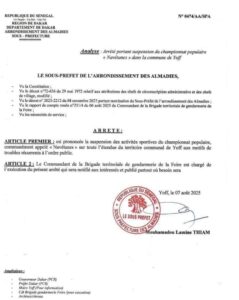 Accueil Sport Yoff: les navetanes suspendus jusqu’à nouvel ordre Sport Yoff: les navetanes suspendus jusqu’à nouvel ordre Par ledakaroistv - août 8, 2025 FacebookTwitterPinterestWhatsApp Le Sous-préfet de l’arrondissement des Almadies, Mouhamadou Lamine Thiam, a suspendu jusqu’à nouvel ordre les « Navétanes » dans la commune de Yoff. Ledakaroistv.info ARTICLES CONNEXESPLUS DE L'AUTEUR A la Une CAN Maroc 2026 : la FIFA cède à la pression des clubs européens et décale la libération des joueurs Sport CAN Maroc 2026 : Le Cameroun dévoile une liste sans Onana ni Vincent Aboubacar et limoge son sélectionneur Sport Lamine Yamal : « Je n’ai pas joué avec le Maroc parce que… » Première Édition ECOFEST : l’ ambassadeur de la Côte d’Ivoire a... Société décembre 4, 2025 Première édition d’ECOFEST : Le cousinage à plaisanterie, un levier de... A la Une décembre 4, 2025 Projet de loi sur le titre de séjour des étrangers résidents... Société décembre 3, 2025 Chaque régime sa bourse ! De Macky SALL à Me Abdoulaye... A la Une décembre 3, 2025 Développement économique : PAMECAS contribue à hauteur de 118 milliards Fcfa... Société décembre 3, 2025